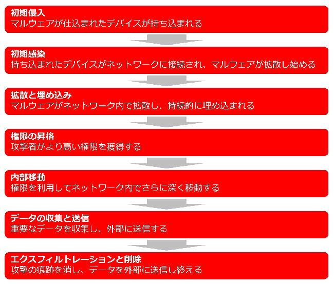 IoTデバイスが身近になった近年では、シャドーITやシャドーIoTも攻撃経路になり得ます。この手口では、一見何の問題もないように見せかけたIoTデバイスを企業ネットワークに潜り込ませ、内部から攻撃を仕掛けます。例えば、従業員が(脆弱性のある)スマートスピーカーなどを社内に持ち込み、社内ネットワークに接続されたことがきっかけで発生する可能性があります。また、工場などでは設備制御機器などが狙われる場合もあります。