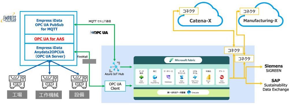 以下の図のように、工作機械あるいは工場内のデータを収集しOPC UAの重要な情報モデルであるOPC UA for AAS(Asset Administration Shell)を経由してMicrosoft Fabricに接続をすることで、Catena-XやManufacturing-Xの対応が見込めます。