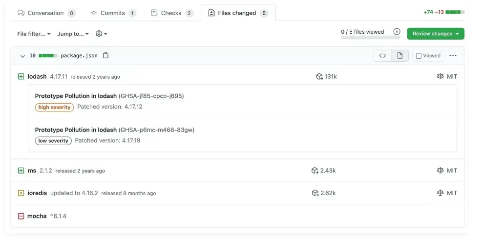 スキャンの結果は、上記イメージのようにプルリクエストのレビュー画面でリスト形式で表示されます。既知の脆弱性があればその重要性(high severityやlow severityなど)が明示されます。