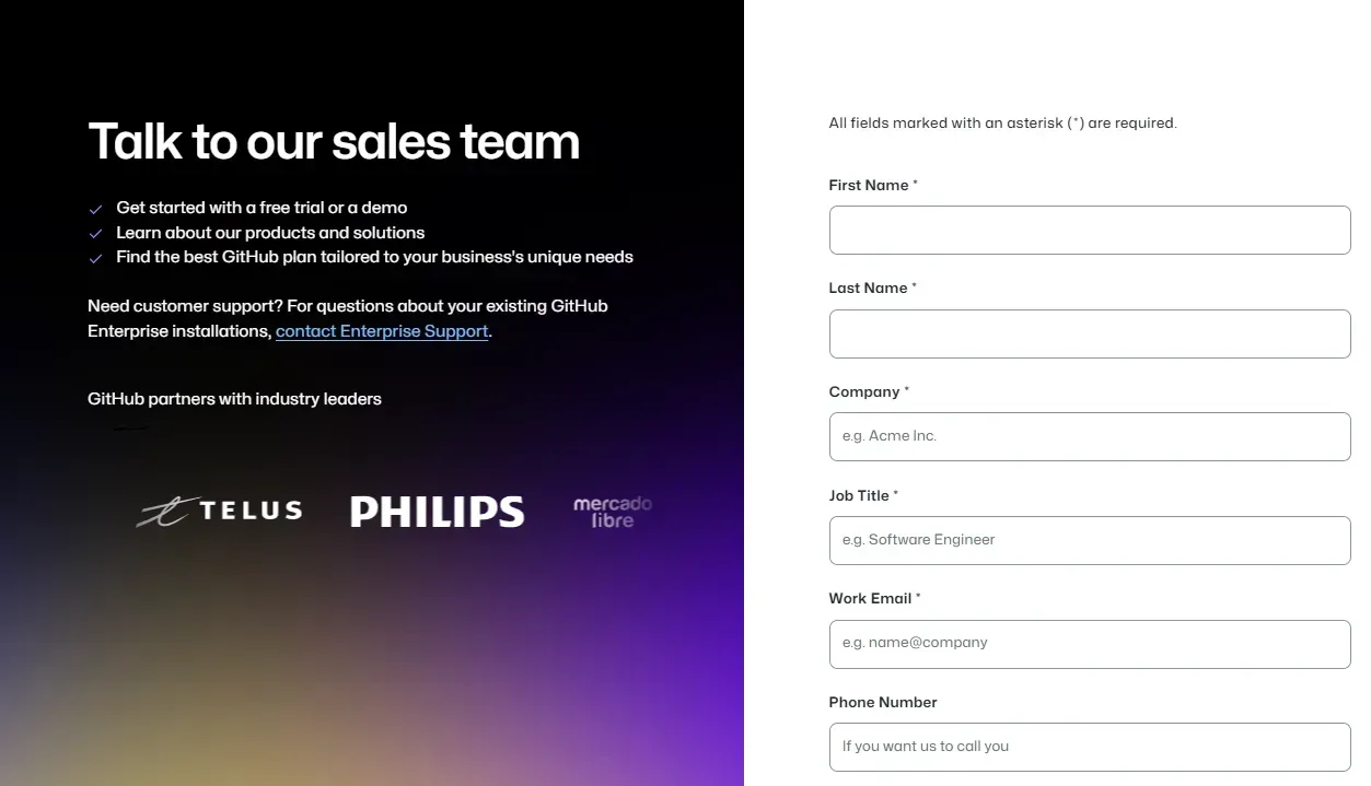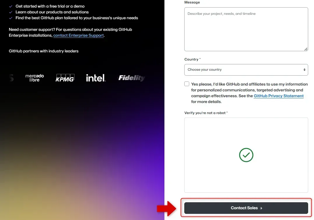 - GHASの有料プラン申込画面へアクセスし、GHASの有料プランの「Contact sales」を選択します。