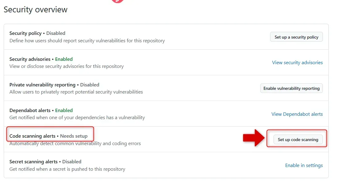 - 「Security overview」ページ内の「Code scanning alerts」セクションで、「Set up code scanning」をクリックします。