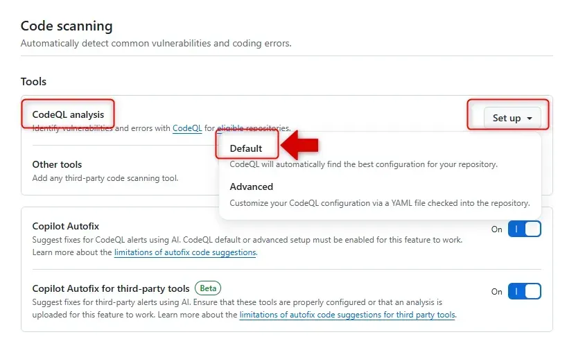 - 表示される「CodeQL analysis」オプションで、「Set up」をクリックし、次に「Default」を選択します。