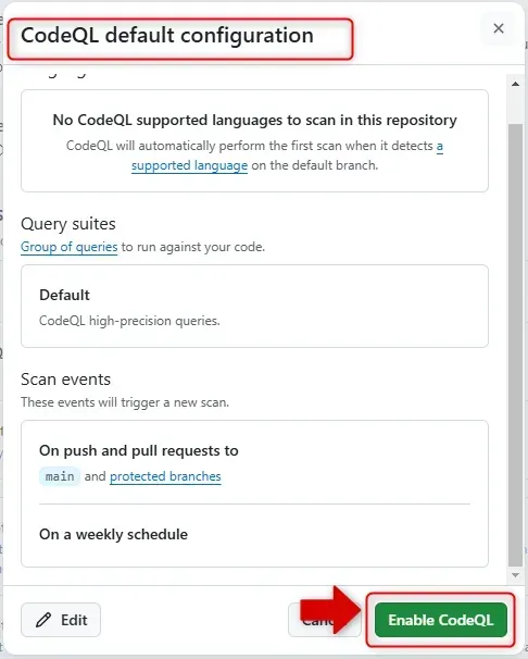 - 「CodeQL default configuration」ページで、「Enable CodeQL」をクリックして設定を完了します。