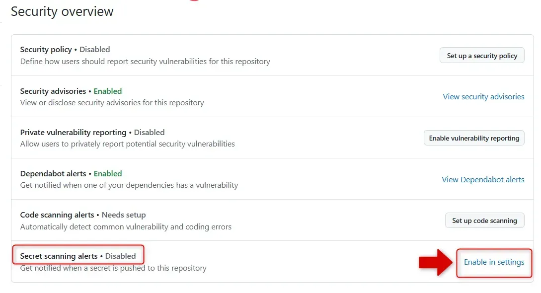 「Security overview」ページ内の「Secret scanning alerts」セクションで、「Enable in settings」をクリックします。