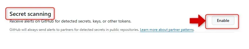 シークレットスキャンの設定を有効にする方法は以下のとおりです。