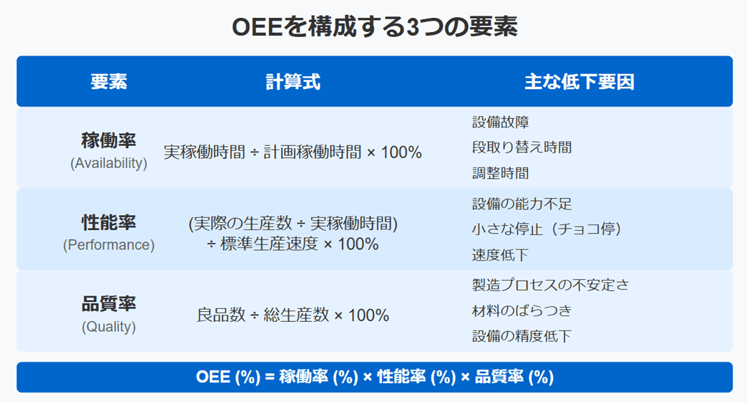 OEE を構成する 3 つの要素について、それぞれの計算方法と意味を詳しく見ていきましょう。