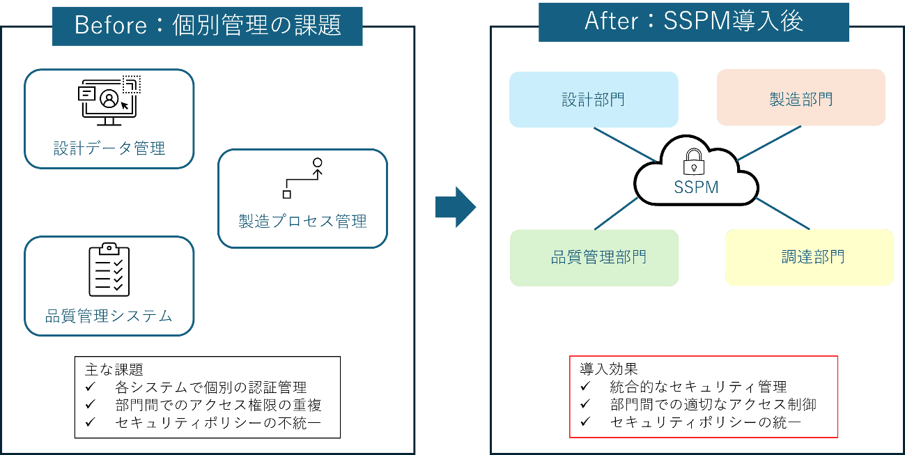 図 1 では、製造業における SSPM 導入の効果を示しています。導入前は設計データや製造プロセス、品質管理システムが部門ごとに個別管理され、権限の重複やポリシーの不統一が問題でした。SSPM 導入後は各部門が SSPM を中心に連携し、SaaS の一元管理と統一されたセキュリティ体制が構築されています。この SSPM は主に以下の 3 つの機能を通じて、組織のセキュリティ態勢を強化します。